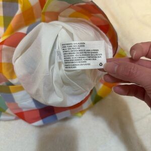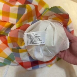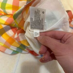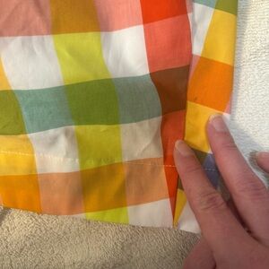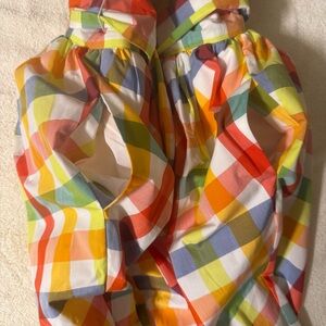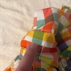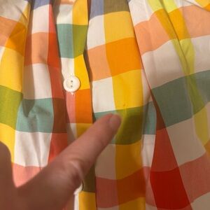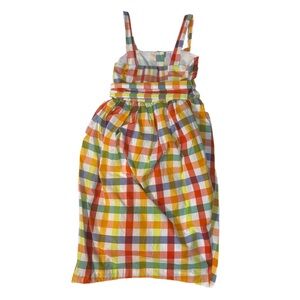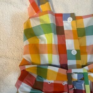 Multi-colored sleeveless midi dress by Christopher John Rogers with button closure, belt, smocked back, and pockets. There is a small hole in the belt appearing to possibly be from a plastic tie for tag, and a few small stains on the front/side bottom of the dress - please see pictures for reference. The material within the dress around the waist/hips provides more volume around the hips.