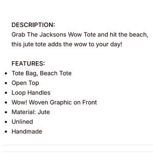 NWOT THE Jacksons “WOW!” Jute Tote Bag