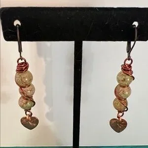 Handmade by Shelly, one of a kind jewelry. Earrings are approximately 2 inches in length with lever back copper ear wires. Wire wrapped snake skin agate with copper heart drop.