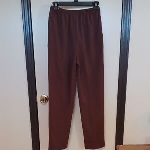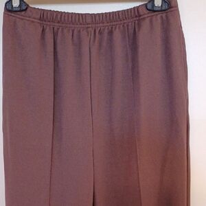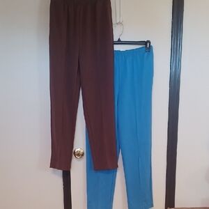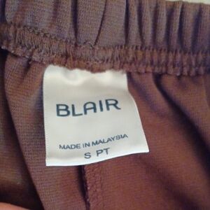 Stylish straight leg pants by Blair. Includes one brown and one blue pair. Perfect for versatile wear. Easy care washer/dryer perfect for elderly women, no zippers or buttons. Pants have a front seam. The size is petite small but the length was still a little long for my 4'10" mom. Barely worn excellent condition.