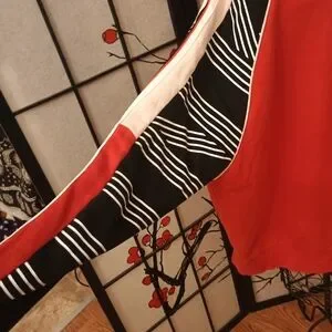 Bold red sweater with black and white striped sleeves. Casual and chic design from PINK Victoria's Secret.