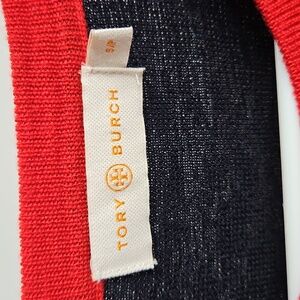 Tory Burch Sweater Navy Blue Red Logo 100% Merino Wool Sz Small Womens