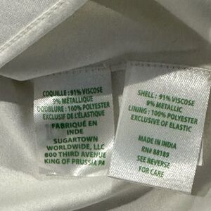 New with tags condition. Chic off white dress with long sleeves and gold polka dot detailing. Features a ruffled hem and elegant design. Perfect for any occasion.