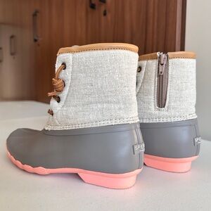 Chic Sperry boots with gray and coral design. Ideal for rainy days