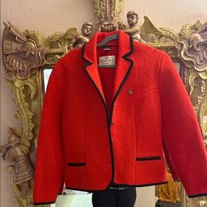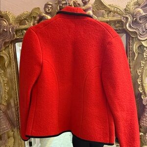 Stylish red wool blazer featuring black trim and buttons. Perfect for a bold, elegant look. European size 42 Fits like an 8 or 10