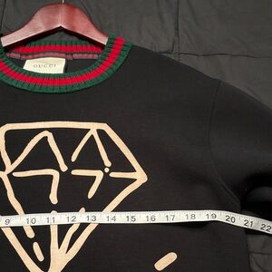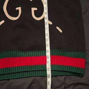Stylish Gucci sweater in black. Features bold red and green trim. Iconic design for a modern look. 100% cotton.Length is 28" amd arms length is 25" from shoulder to wrist, can fit men or tall women.