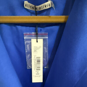 Alice + Olivia Blue Blazer, size 12. This versatile piece is perfect for both professional settings and casual outings. The vibrant blue hue adds a pop of color, ensuring you stand out in any crowd. With a length of approximately 22”, this blazer offers a tailored fit that enhances your style while providing ease of movement. Pair it with tailored trousers or your favorite jeans for an effortlessly sophisticated look.