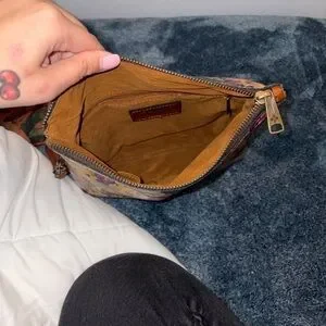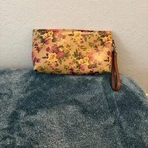 Elegant wristlet with vibrant floral pattern. Features a secure zipper closure. Ideal for stylish outings.