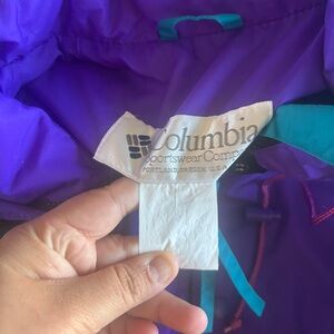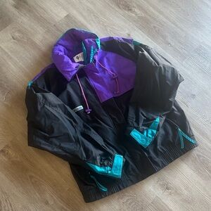 black, purple, green double layered ski jacket inside layer is removable plenty of zippers and buttons pockets have zippers