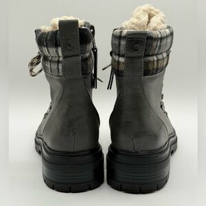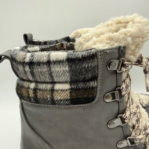 Comfy Gray/White Plaid Lug Sole Hiker Round toe Bootie with a soft shearling panel and criss cross lacing and zipper closure.