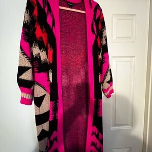 Bold pink and black cardigan with geometric design. Open front style. Perfect for layering.