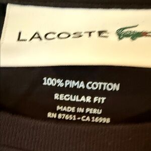 Sleek dark tee by Lacoste. Features signature logo on chest. Ideal for casual wear. Pima cotton