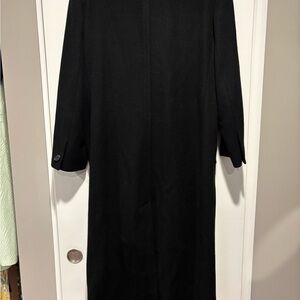 Chic double breasted black coat with a sophisticated classic look. Fully lined, small tears inside near underarm, not visible on the outside. One button was replaced and does not match, but a spare button is on the inside and ready to be swapped. Overall condition is very good.
