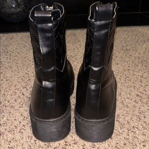 Black leather boots. With the iconic accessories quilting. The rubber sole makes them light.