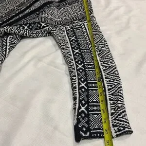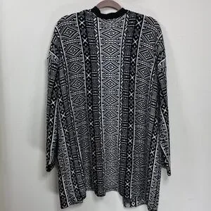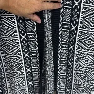 Thick cotton, gently used but in excellent condition (see photo for details) Chic black and white cardigan. Features intricate patterns. Ideal for layering.