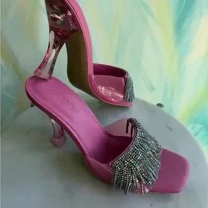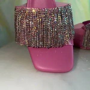 Step out in style with these chic pink heeled mules. Adorned with dazzling rhinestone fringe, they add a touch of glamour to any outfit. Perfect for a night out or a special occasion.