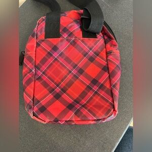 Vibrant plaid pattern. Adjustable strap for comfort. Ideal for everyday use. Has slight wear on bottom edges.