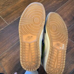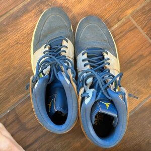 Air Jordan 1 Nouveau 'Dunk From Above' sneakers in a Wolf Grey, Gold Leaf, French Blue, and White color. Elevate your look with these Nike sneakers. Navy and metallic gold accents create a bold style. Ideal for casual wear. Excellent condition, only worn few times .