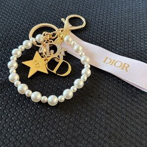 Christian Dior pearl w ribbon and four charms on bag charm keychain. Unstamped.