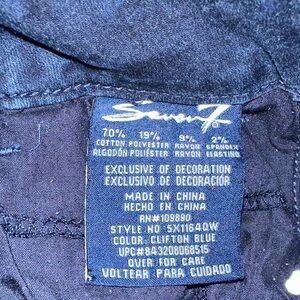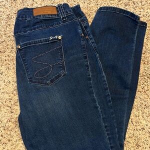 Stylish dark blue skinny jeans. Features signature stitching on back pocket. Comfortable fit.