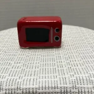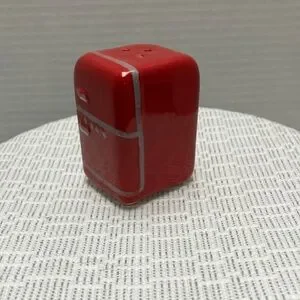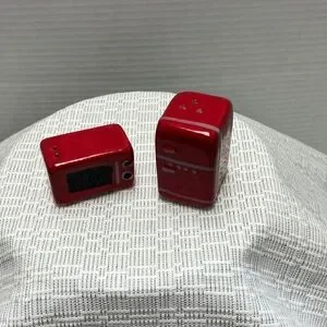 Charming red salt and pepper shakers shaped like kitchen appliances. Perfect for adding a playful touch to your dining table.