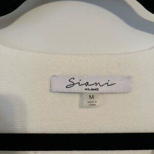 Stylish white V-neck sweater. Features unique feathered cuffs. Perfect for elegant outings.