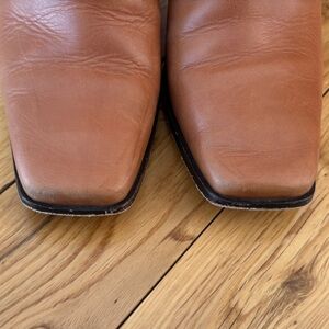 Paige square toe ankle boots US women’s size 9. Genuine leather in light brown/cognac color. Superficial scratches in leather, especially on the heels. Comes with original box and dust bag.