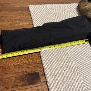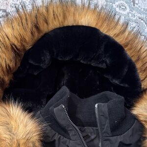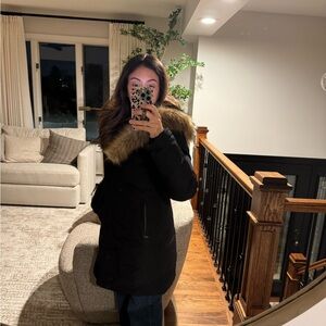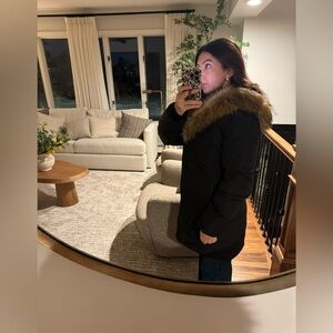 Stay warm and stylish with this elegant black parka featuring a luxurious faux fur trim. Perfect for chilly days, this coat combines fashion and function effortlessly. Purchased from Aritzia. Medium. Zippered pockets