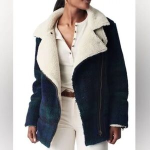Faherty Montana Faux Shearling Moto Coat in a "Black Watch" plaid pattern. The coat features an asymmetric zip closure, a cozy faux-shearling collar and lining, and a navy and green plaid exterior.