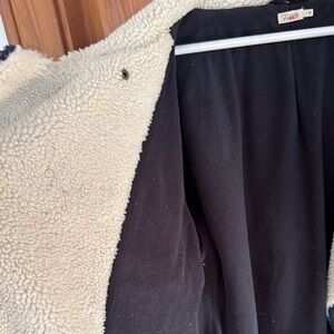 Cozy teddy jacket with plush cream interior. Features a navy and black plaid design. Perfect for chilly days.