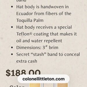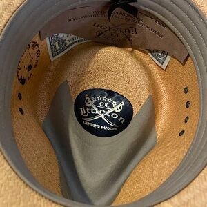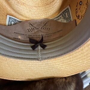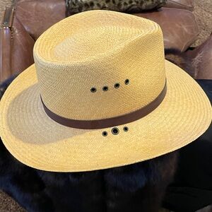This is an authentic Panama woven in Equador, Stylish men's Panama hat featuring a classic brown band. Perfect for adding a touch of elegance to any outfit. This hat has a secret money holder inside, adding to the adventure of wearing. This hat is reflective of the man or lady wearing it, put some time in with it and you will make memories. it was purchased by me at the Colonel Littleton store in Lynnville Tennessee,, absolutely like new,,,really was rarely worn,,, will be shipped in original box