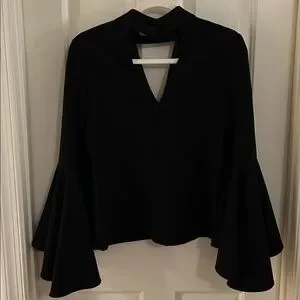 This elegant black women's top features a stylish V-neck and bell sleeves, perfect for any occasion