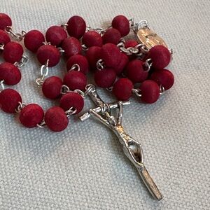 Beautiful red rosary with a silver crucifix. Features a religious image on the case. Features Pope John Paul II