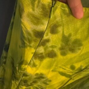 Vibrant lime green dress with dark green floral design. Ideal for sunny days.back hidden Zipper. Gorgeous Dress, backless with spaghetti straps. Form fitting top .