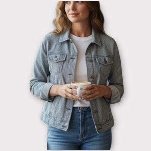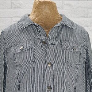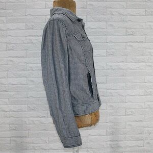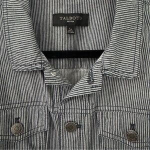 Talbots Petite Jean Jacket Blue White Railroad Thin Pinstripe Denim Collar Large