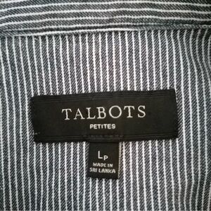 Stylish blue and white railroad / thin pin striped collared jacket by Talbots. Talbots Women’s Petites. Made of pure cotton. Machine washable. This is the perfect lightweight denim type jacket to wear year round. Classic button down style.