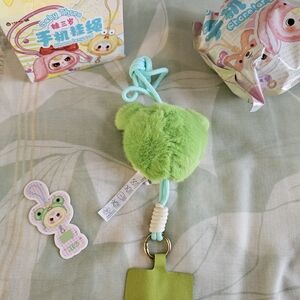 Adorable green frog plush phone lanyard. Baby Three - Soft and cuddly, this is a fun accessory. Cones with original packaging & card. Box is slightly damaged.