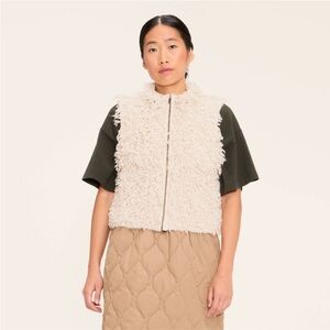 This Loopy Yarn Sweater Vest from Woolrich × Target blends comfort and classic style. Made from recycled polyester-, nylon-and wool-blend jersey fabric, this sweater vest showcases a textured yarn construction in a solid cream color. Designed with a front full-length zipper and no sleeves, it hits below the waist.