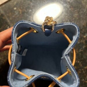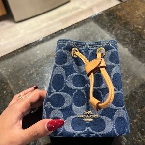 Coach Signature Denim drawstring wristlet, with gold chain and cherry charm. Style CZ031. Like new, never worn.