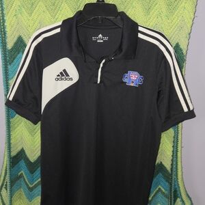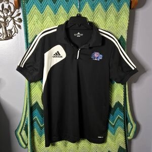 Men’s Large Adidas Climalite polo from the 2014 College Rugby Championship. Black performance fabric with white 3-stripe shoulders, embroidered CRC/NBC crest, and Adidas logo. Hidden button placket design.