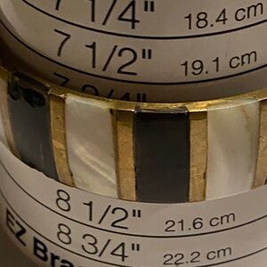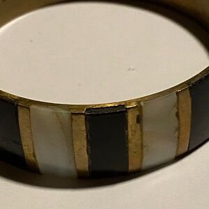 Chic bracelet with gold and black accents. Perfect for any style. gorgeous, brass Onyx and mother of pearl bangle bracelet however, it does have some signs of Ware and the Onyx in a few places has some chipping.