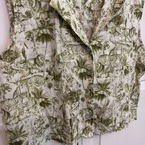 Chic sleeveless linen blouse with intricate green jungle patterns. Perfect for casual wear. Size L. Great condition!