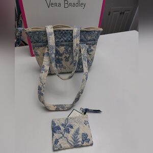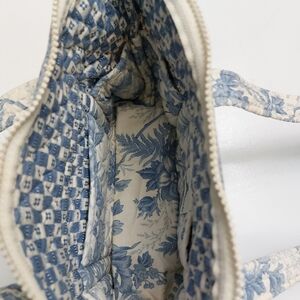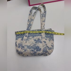 Tote with front slip pocket, top zip closure and interior removable hard bottom and slip pockets. Measures about 12w x 8h x 3d. Generally very good condition, inside of straps has discoloration, slight marks on bottom, no worn spots.
