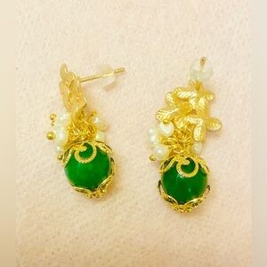 These elegant earrings feature a stunning combination of gold and green, adorned with delicate floral designs. Perfect for adding a touch of sophistication to any outfit.