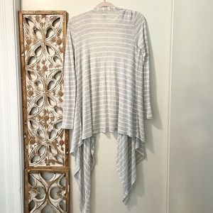 Whisper light and oh-so-soft this amazing asymmetric cardigan is like wearing a feathery cloud. Pale gray and white stripes give a wonderful coastal vibe and elevate any outfit. Open drape front, slant pockets, high low hem. Can be worn open, tied it even belted. It’s an wonderfully versatile layering piece. NWOT, never been worn.
