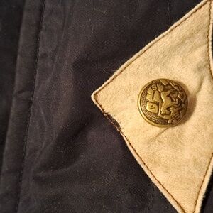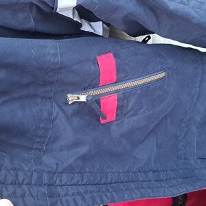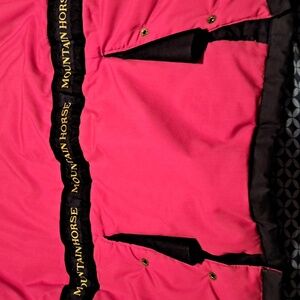 Stylish and warm womens horse riding jacket in navy and pink. Perfect for chilly days. Insulated and rain repellent material. Rolled attached hood at the neckline. Reflective strips on sleeves that can be rolled up or down. 5 pockets. Air vents in the arm pits. Sleeves at the cuff zip up or down. Side zipper to access the inside of the jacket. Flap on bottom of the back for comfortable riding. There looks to be paint on the fabric at the top of zipper on left arm. Front left pocket has a piece of fabric on pocket unsewn.