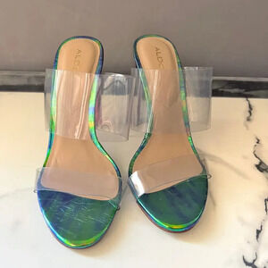 ALDO PVC clear double strap green iridescent mermaid sandal heels. Almond toe, slip on. Curved 4" block heel. Leather lined. In excellent condition, barely worn. Size 8.5.