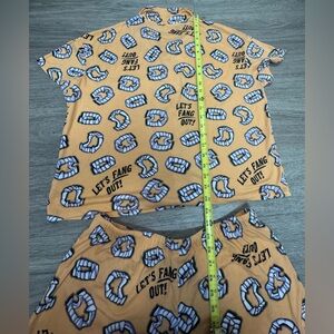 Enjoy a cozy night in with this vibrant orange pajama set featuring a playful fang print. See images for measurements.