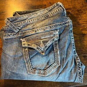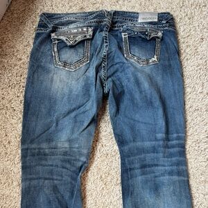 Stylish boot cut jeans with a classic blue wash. Features detailed stitching and a comfortable fit. Wear on the back bottoms of legs. See photos.