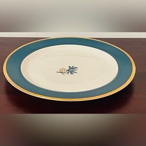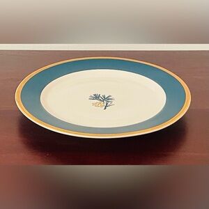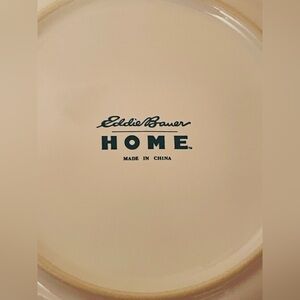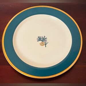 Set includes 4 dinner plates and 4 matching salad/dessert plates from the Eddie Bauer Home collection, featuring a rich teal rim, warm gold banding, and a charming pinecone motif at center. This coordinated 8-piece set has a classic lodge-inspired look—perfect for cabin décor, fall and winter tablescapes, or everyday rustic dining.